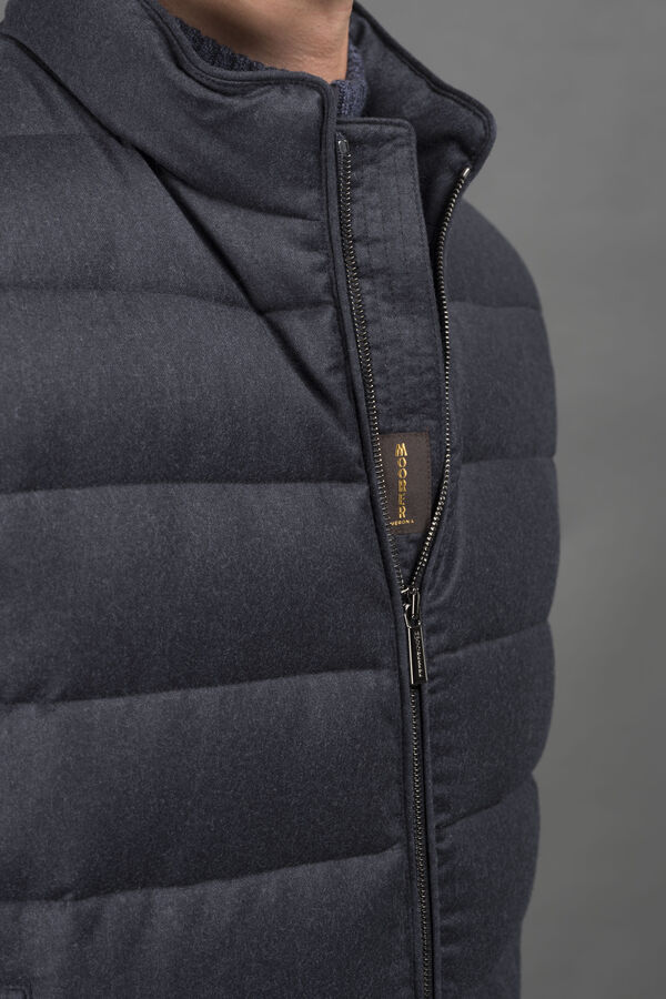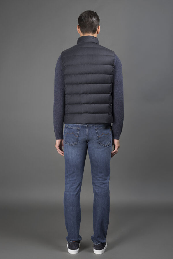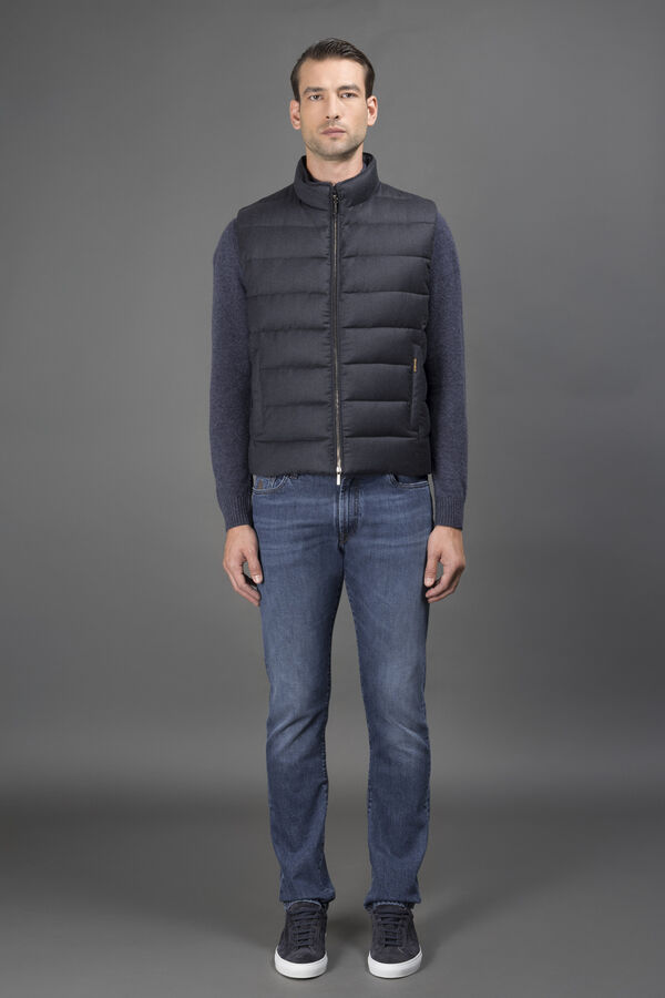 ダイレクトインジェクション法でグースダウンを詰めた、ブーダンキルティング入りのダウンベスト。軽やかで心地よい、バージンウールとカシミヤのフランネル生地を使用。生地はメランジ調に糸染めしたヤーンで作られています。